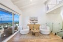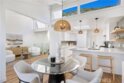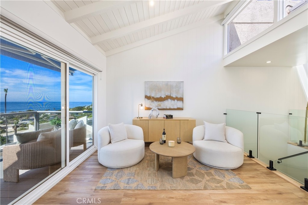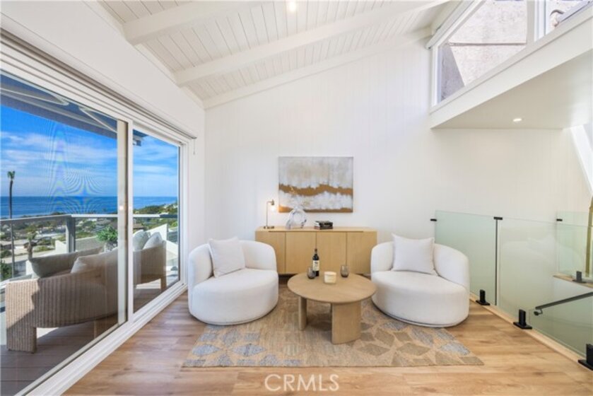 A luxurious coastal retreat perfectly capturing the elegance and stye of upscale beach living. Completely remodeled and offering stunning panoramic views of the ocean, Catalina Island, white water, rocks, and sand from every room—a full sensory experience surrounded by the beautiful Pacific Ocean and Laguna's Greenbelt. One of Laguna's most serene locations! This spacious 2 bedroom, 3 bathroom condo has been thoughtfully reimagined with a blend of high-end finishes and comfortable design. The upper level welcomes you into a spacious light-filled living room with cathedral beamed ceilings, painted tongue and groove walls, a cozy gas fireplace finished with ceramic tile and a wood mantel, and warm wood-like vinyl floors. The open floor plan draws you past the living room to the captivating views, leading you to a cozy den that opens to a deck—ideal for relaxing, socializing, and enjoying the ocean breezes. The kitchen is a dream, featuring all-new stainless steel Thermador appliances, a six-burner stove, custom cabinetry and a breakfast bar that invites conversation over coffee. The deep green tile backsplash and open wood shelves add a touch of natural elegance, while the wine fridge and walk-in pantry ensure you're ready for any gathering. Adjacent to the kitchen, the dining room offers front-row views, creating the perfect setting to gather with family and friends. Glass handrails elegantly frame the stairs and decks, enhancing the open and light filled rooms. The lower level includes a primary suite with a private deck, a desk area with built-ins, a walk-in closet, a separate soaking tub, walk-in shower, and dual sinks. The second bedroom offers a deck with views and a large closet. This level also includes a laundry room with new full-size LG washer and dryer, a second bathroom with a walk-in shower, and a large storage closet. This highly-desired community features an elevator to all levels, including the parking garage, where you'll find a dedicated space and storage. Proximity to the elevator is also a big bonus for this condo, as well as a heated community pool, sun deck, and outdoor shower. Just steps from the Montage Resort, beautiful beaches, popular Laguna restaurants, a shopping center, 2 parks, Laguna Trolley stops and more!. Don't miss out on the opportunity to own a piece of luxurious Souther California living in Laguna Beach. Live the sophisticated beach life with a blend of style and serenity in this stunning coastal home.