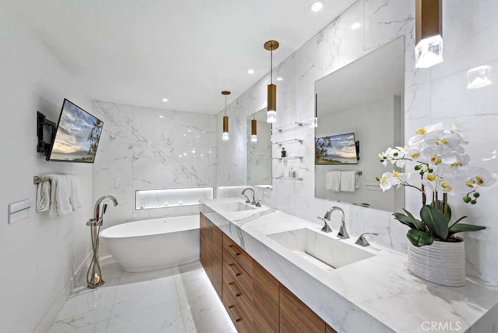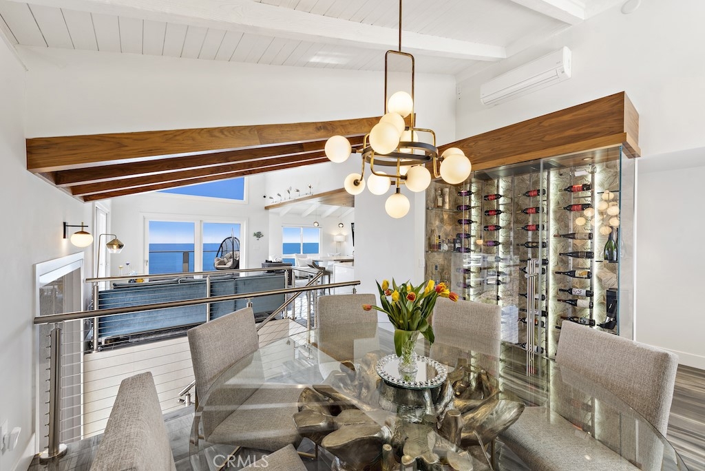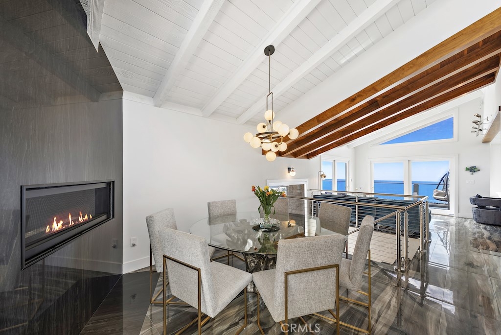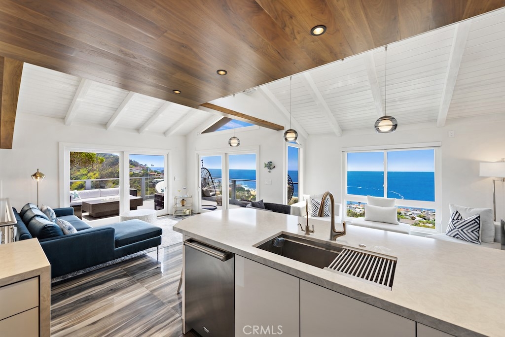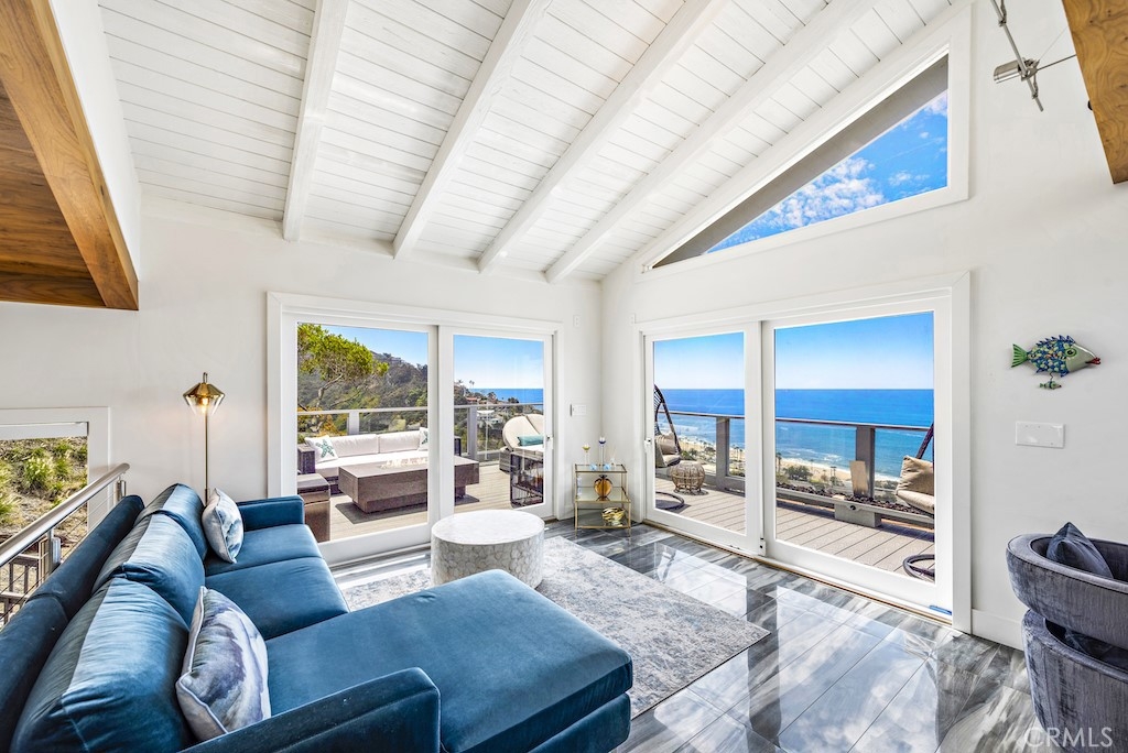 Experience panoramic, unobstructed whitewater ocean views from this stunning residence located in the sought-after gated Aliso Laguna community. Recently remodeled with impeccable taste and attention to detail, this home captures breathtaking panoramas of the Pacific, Catalina Island, city lights, and renowned Laguna Beach coastline that impress from nearly every room. The enviable corner location provides total privacy, an excess of natural light, and an expansive wraparound deck off the main floor to entertain al fresco while enjoying the view. The airy and open two level design is complemented by soaring beamed ceilings, picture and clerestory windows, and skylights that are found throughout the home. The upper level hosts a gourmet chef's kitchen with commercial grade appliances and sleek cabinetry, a dining room with contemporary fireplace and climate controlled, top of the line wine cellar, and a living room that opens on two sides to the ocean view deck. Wake up to the sound of waves crashing from the three bedrooms located on the lower level, including the primary suite boasting a spa-like bath with heated floors, dual sinks, soaking tub, and steam shower. Other recent upgrades include updated electrical and plumbing (pex), newer AC split system (2019), reverse osmosis system, tankless water heater, and more. Located just a stones throw to the sand and famed Montage resort, this home does not disappoint.