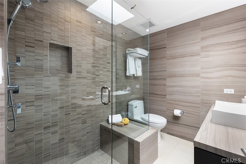 Spectacular Views from this updated chic top floor condo in the Ocean front community of Laguna Sands. This 2 bedroom, 2-bathroom condo has been totally remodeled including sliding doors that open to showcase the panoramic ocean and beach views clad with automatic blinds. The open concept floor plan with gourmet kitchen features an island with stainless steel countertop, stainless steel backsplash, custom mahogany cabinetry, Subzero built in refrigerator, induction cooktop and Bosch appliances. Other features include imported limestone flooring in main living area, updated bathrooms in a spa décor with quartz countertops, dual showers, imported Italian Marble in guest bath and skylights that open to capture the ocean breezes, stackable laundry, Ceiling fans, modern built in closet systems in both bedrooms and LED recessed lighting. This turnkey home is available fully furnished! The building is gated, with elevator access from the gated subterranean parking garage. The community includes large decks for entertaining and a heated beach side pool and direct beach access. Great Laguna Beach location close to restaurants and shopping!