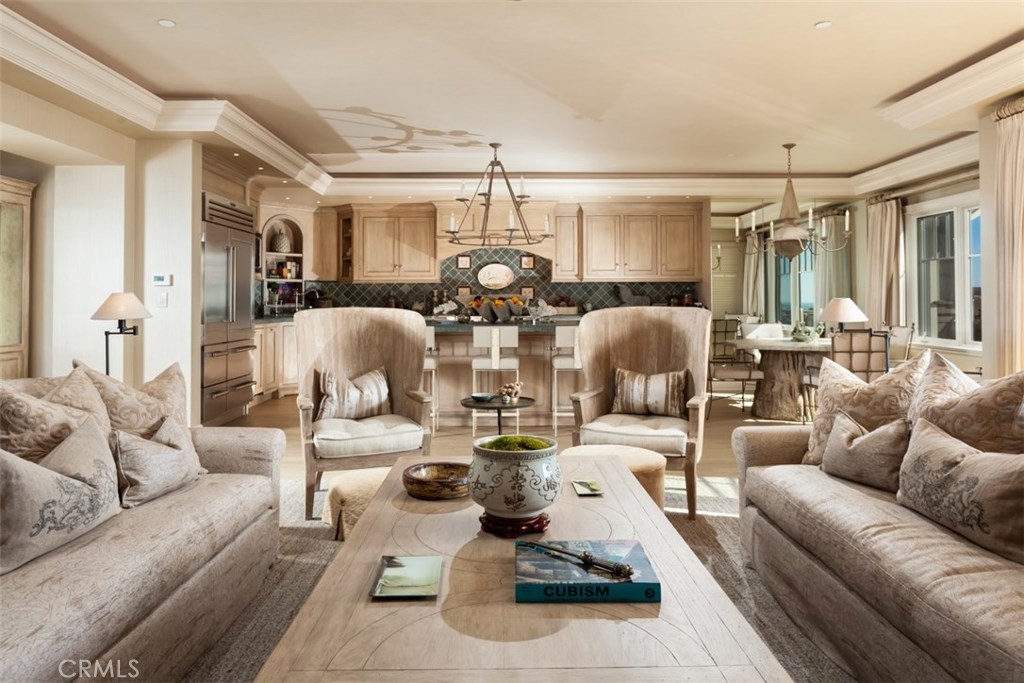 Live every day as if you’re experiencing the ultimate dream vacation at this luxurious ocean-view condominium in Laguna Beach. Offering a prime upper end location in the limited-edition enclave of Montage Beach Villas, the fully remodeled and upgraded residence offers the look and ambiance of a very sophisticated model home, complete with furnishings, which are negotiable. Main living areas and a spacious terrace welcome priceless views that embrace the ocean, Catalina and sunsets. Beyond a gated entry, the 3-bedroom, 3-bath home of approx. 2,727 s.f. presents a fireplace-warmed living room with custom built-ins that flows effortlessly into a dining room and impressive gourmet kitchen. Entertain guests at a large island with bar seating and a farmhouse sink, and enjoy the convenience and appeal of custom furniture-caliber cabinetry, stone countertops, tile backsplash, and professional-grade stainless steel appliances including a built-in refrigerator, 6-burner range, warming drawer and wine cooler. High ceilings are embellished with crown molding and indirect lighting, wood flooring is featured in most spaces, and designer wall and window treatments are showcased throughout. Personal luxury is redefined in an ocean-view master suite with a romantic balcony, a fireplace, dressing area, walk-in closet with custom built-in cabinetry, and a lavish bath with granite countertops, custom tile work, dual vanities, a rain shower with recliner bench, and a soothing spa tub.