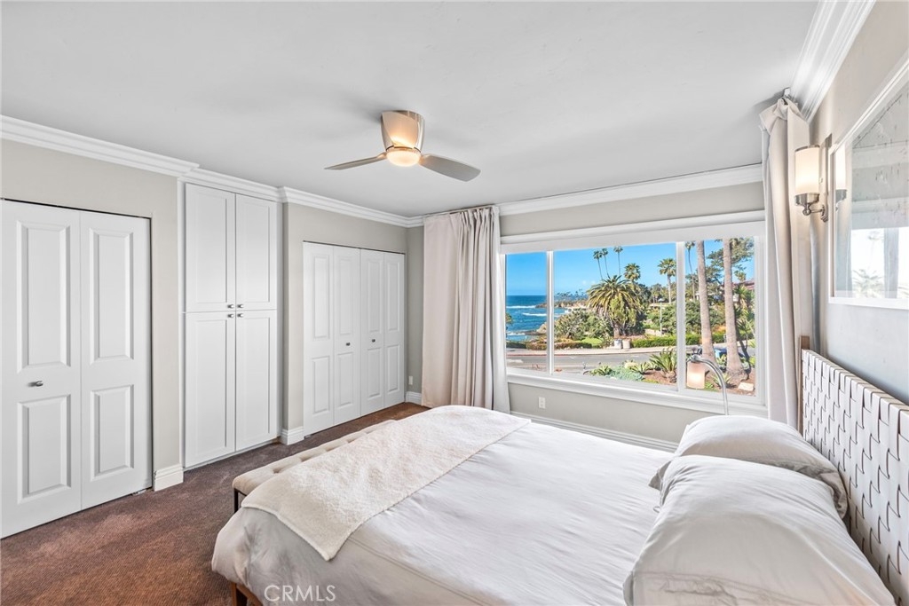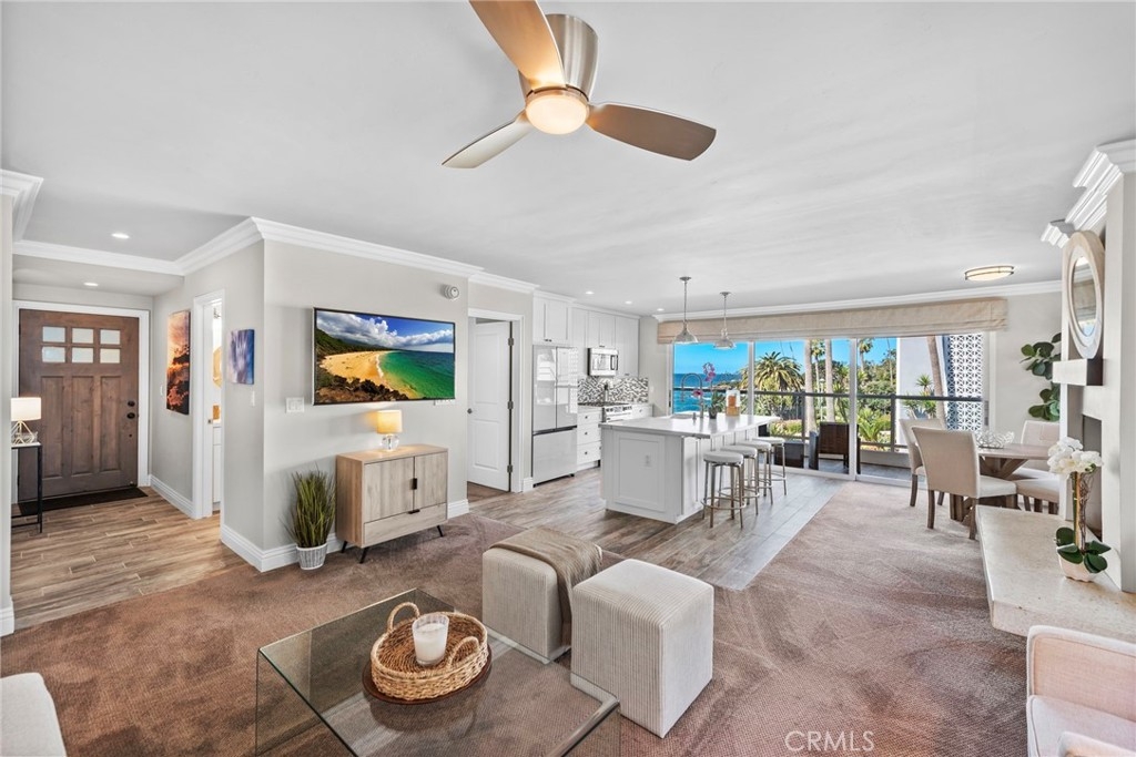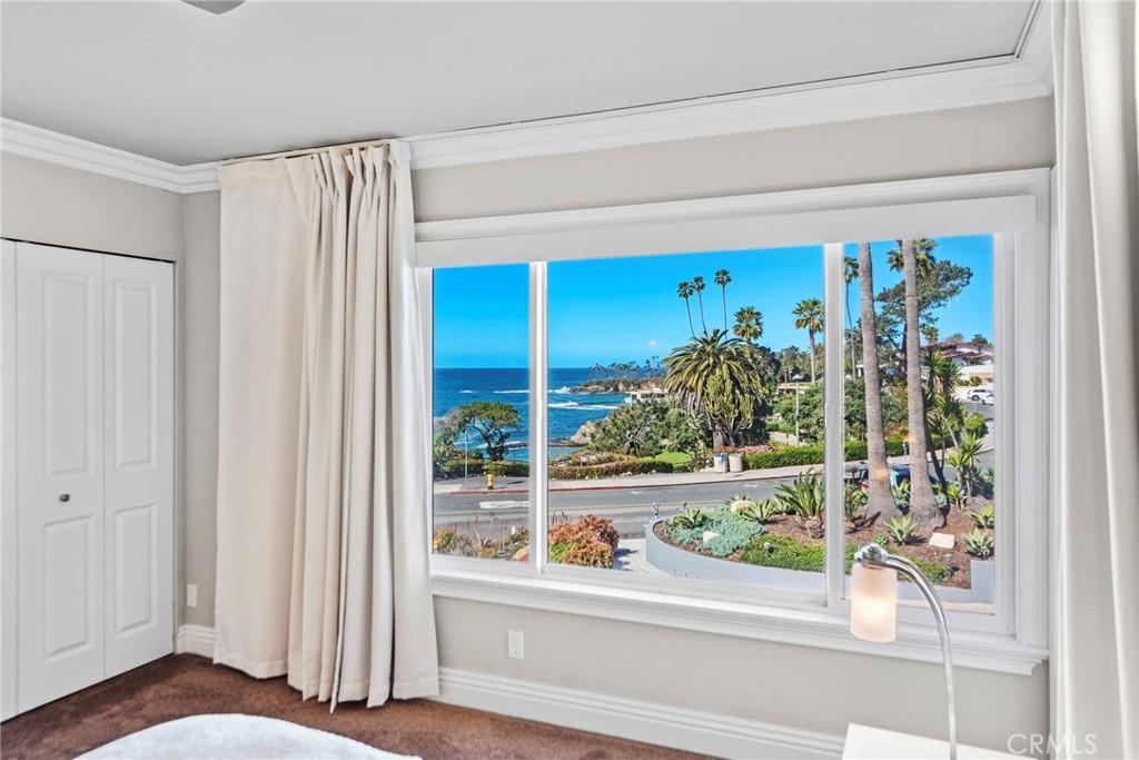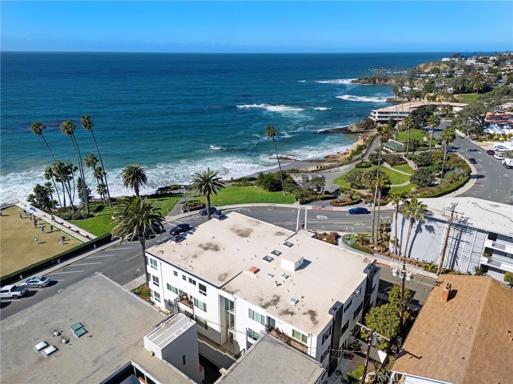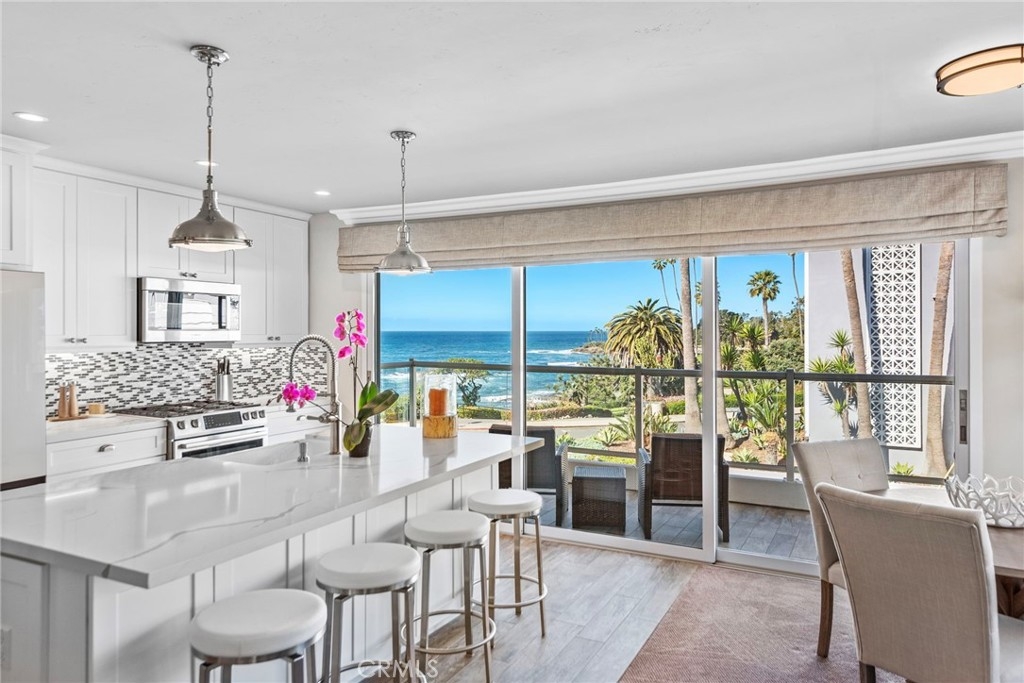 Your Ocean Front Pied-A-Terre awaits in vibrant North Laguna. Incredible vistas of the coastline, white water and Catalina Island including stunning sunsets. Beautiful modern remodeling throughout for a truly turnkey living experience. Great room concept living, dining and kitchen with La Cantina sliding doors to a dedicated ocean view deck. Quartz kitchen with stainless steel appliances and large island with bar seating. A center piece of the great room is a brick gas burning fireplace with stone hearth. This end unit has a private feel, accentuated by side windows looking out to greenery landscape. The bedroom suite looks out to the ocean, offers wall-to-wall closet storage and an en suite modern bathroom. A second full bathroom and an individual washer/dryer in unit provide added conveniences. A desirable area on the north end, providing a wonderful setting to view 4th of July fireworks or in any season, park in your dedicated garage spot and explore town. Experience the evening moon light over the water and soothing sounds of waves. Corner lot location at Cliff & Myrtle, also known as 496 Cliff Drive, a building of only 10 condominiums with a newly painted exterior. Secure front building entry and gated parking with assigned parking and storage. Community elevator to all levels allows ease of every day living. Fine dining, art galleries, shops and the most scenic cove beaches await you within yards from your new Laguna Beach residence.