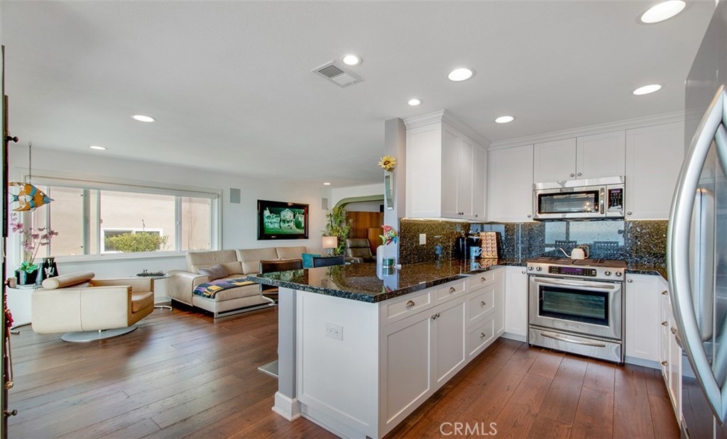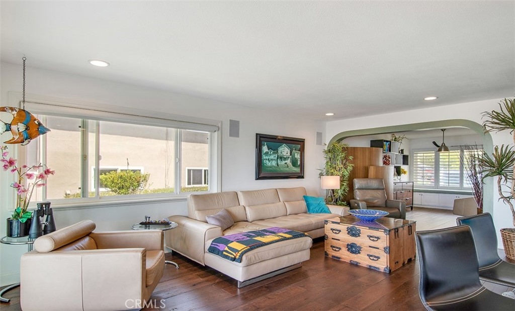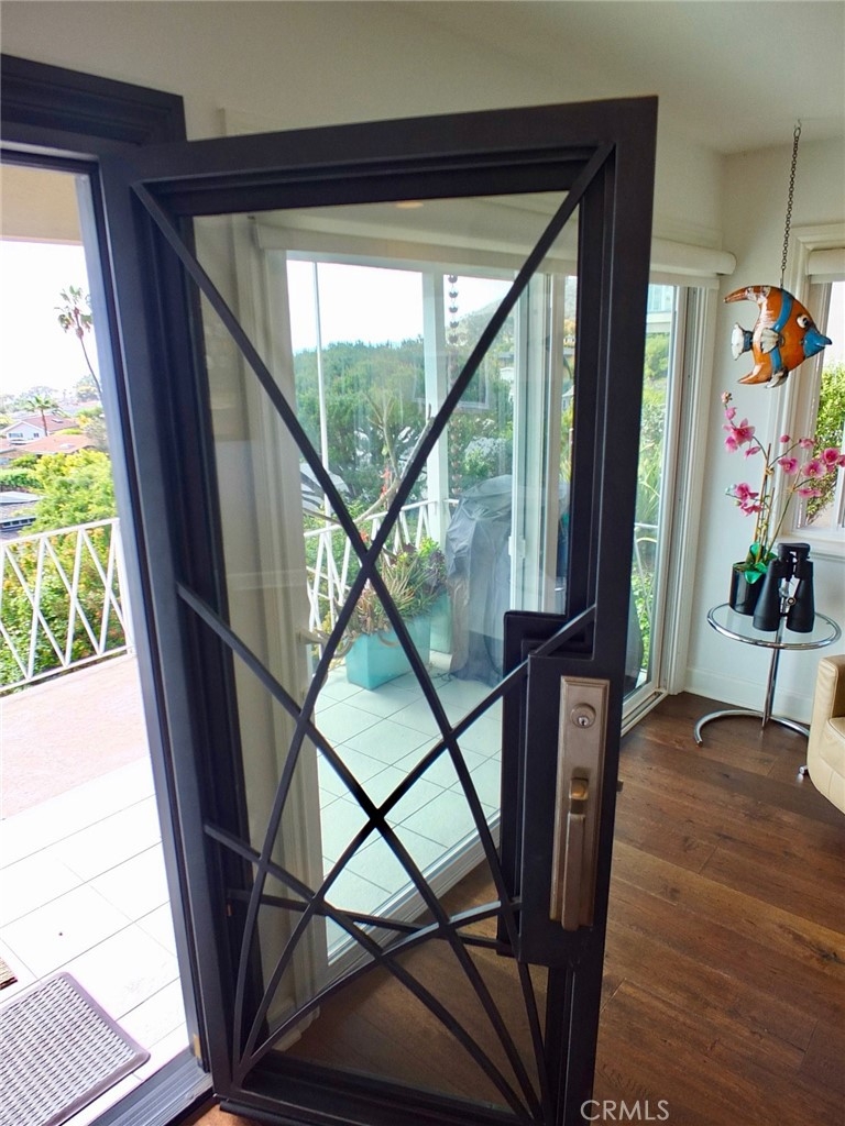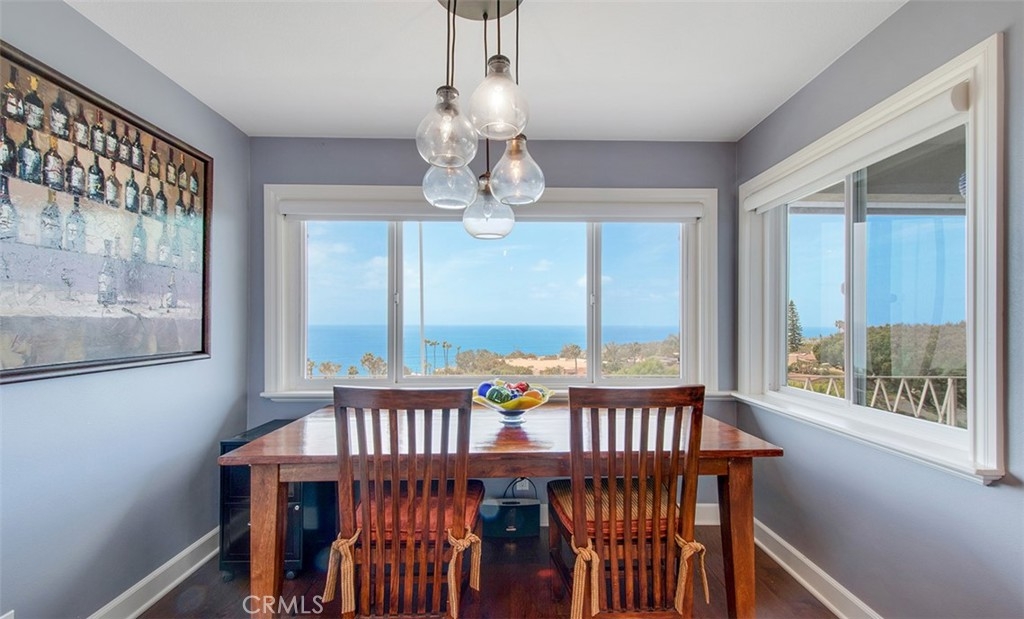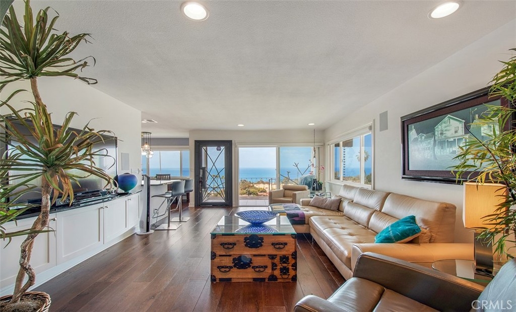 Incredible 180 degree ocean and coastline views with stunning Catalina sunsets from this extensively remodeled, top-floor, bright corner-unit nestled on a cul-de-sac above Treasure Island Beach and the Montage Resort. The unit features an open floor-plan, wood floors throughout, recessed lights, newer windows, custom cabinetry, tile and high-end touches. The kitchen was remodeled with new cabinets, granite countertops with full granite backsplash, stainless steel appliances, high-end finishes and fixtures. The bathroom has a large beautiful vanity with double sinks, skylight, full shower. On-site laundry facilities. Private 1-car garage with remote and storage. Currently used as a one bedroom and office/den and can easily be converted back to a two bedroom. Included in the monthly HOA fee is the $22.00 for the land lease. The HOA’s resort-style pool has incredible panoramic, ocean and Catalina views with lounge chairs, outside entrainment area, casual seating, dining areas, bar, & hot showers after a day in the sun.