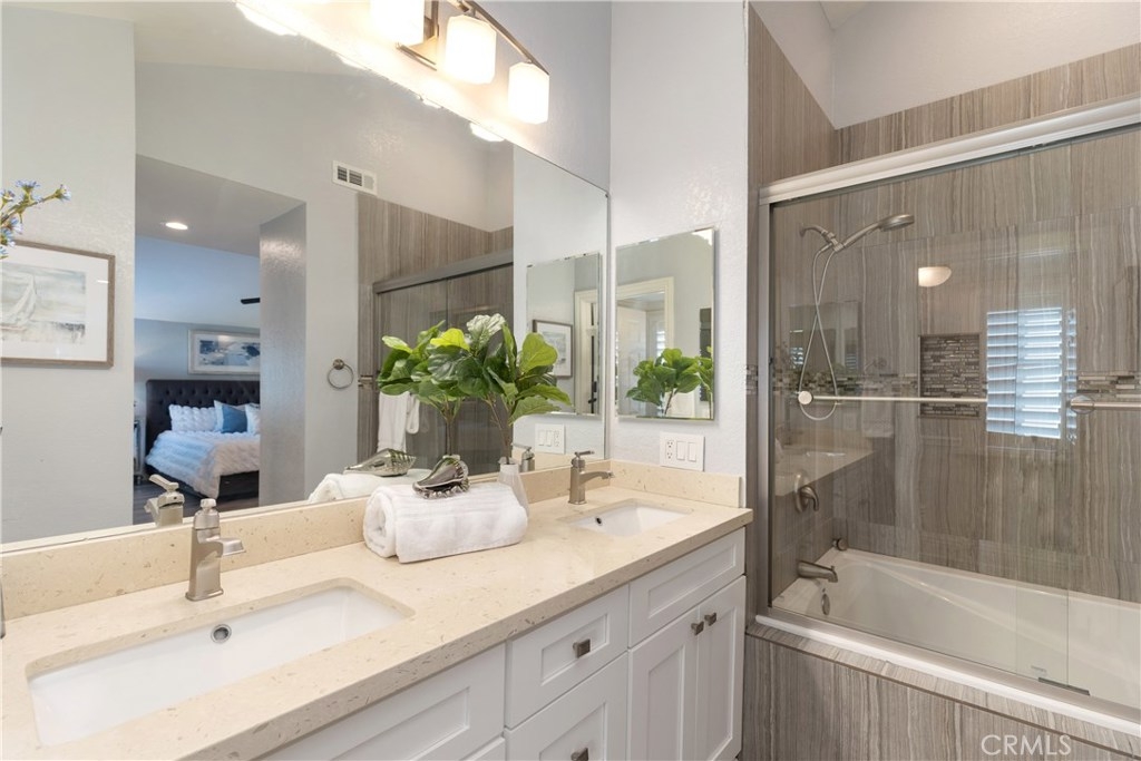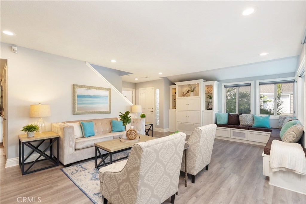 Welcome home to The Terraces Laguna Beach! Less than five miles to Main Beach in Laguna Beach! This beautifully upgraded 3 bedroom/2.5 bath townhome is the perfect private oasis. Enter into the great room with custom built-in cabinetry and L-shaped window seating with extra storage. The cozy fireplace has a custom wood mantle, black granite tile hearth, and more storage cabinets. Remodeled kitchen has a combination of crisp, white upper cabinets, stainless steel lower cabinets, Bosch dishwasher, stainless steel appliances (refrigerator included!) and custom shiplap at the breakfast bar. Updated private powder room completes the downstairs. Enjoy peaceful evenings on the private redwood deck with new patio cover. Master bedroom suite has custom closet organizers, mirrored wardrobe doors, plantation shutters, and remodeled bathroom, with new tub and enclosure. Tucked next to the master bedroom is the perfect space for a home office. Two spacious secondary bedrooms have custom closet doors and plantation shutters. The hall bath has been tastefully remodeled with beautiful finishes. Beachy wood laminate flooring is throughout the home for easy care, new recessed lighting, and every bedroom has a ceiling fan. Two car attached garage with washer/dryer hook-ups, storage racks, and an additional parking space is included. New toilets, new furnace and A/C compressor. Community has a private pool, spa, and built-in BBQ.