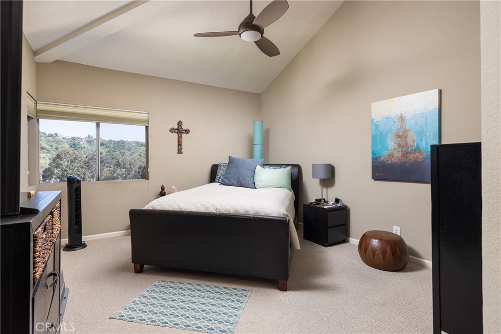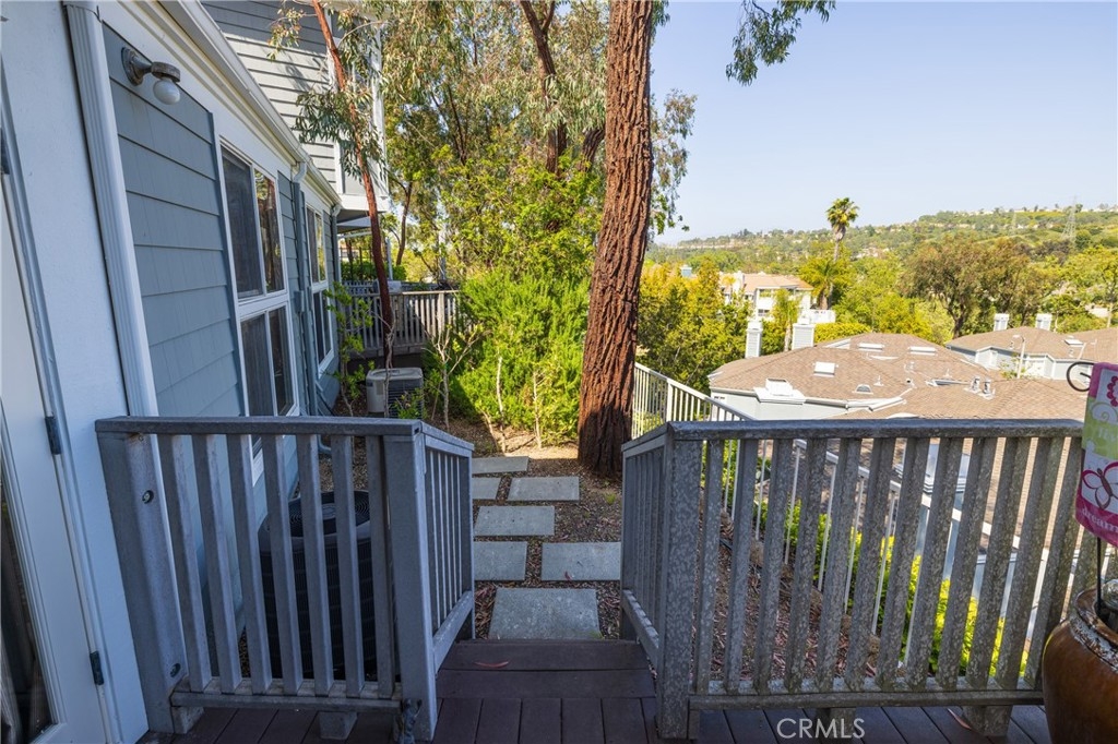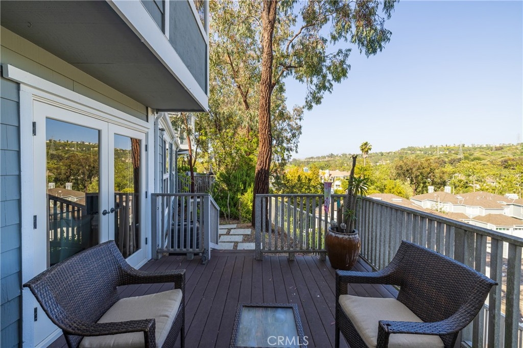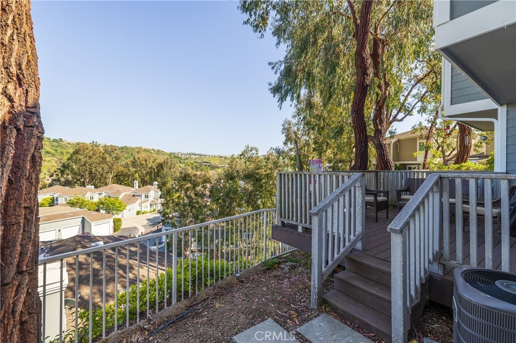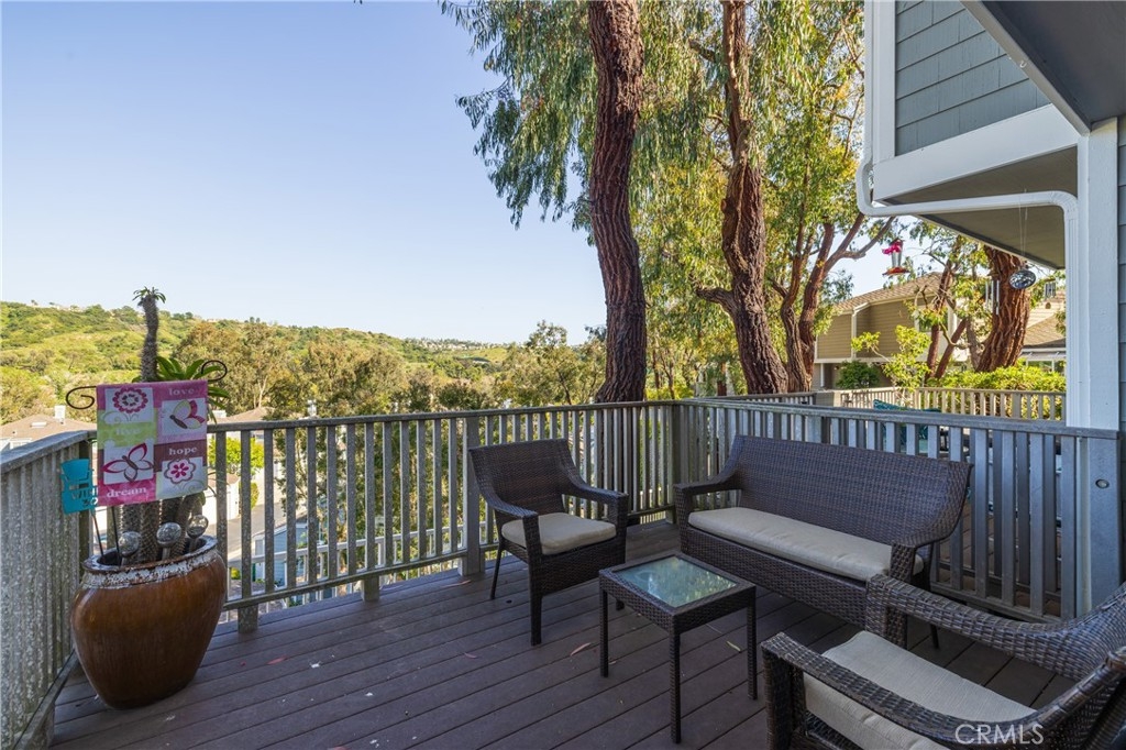 Enjoy the highly sought after Laguna Beach lifestyle and school district here in Laguna Terraces. This property features cathedral ceilings, skylights, and panoramic views throughout plus a small yard to supplement the outdoor deck. The main level has beautiful honed French limestone flooring. The kitchen, overlooking the dining and great room, is complete with upgraded cupboards and stainless steel appliances. Upgraded double French doors lead to the serene deck and yard. This two-bedroom home includes a primary room with views and a large bathroom retreat with dual sinks and a large jacuzzi tub. The second bedroom is en-suite. Parking includes 2 garages, a direct-access 1 car garage complete with laundry hookups plus a separate enclosed 1 car garage. HOA amenities include 2 pools and spa and outdoor cooking area. Centrally located in the Canyon close to hiking trails, shopping, world class restaurants, and within the Laguna Beach school district. Enjoy easy commuter access to toll roads, freeways and beach cities.