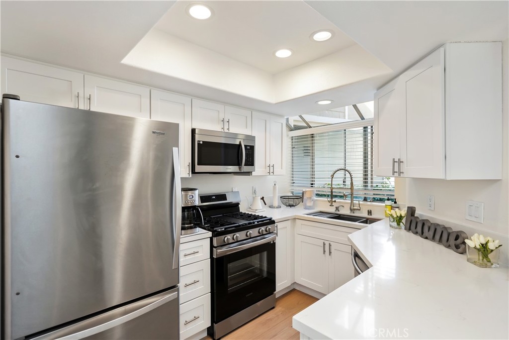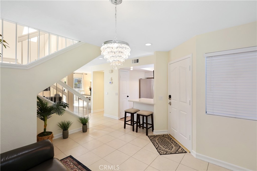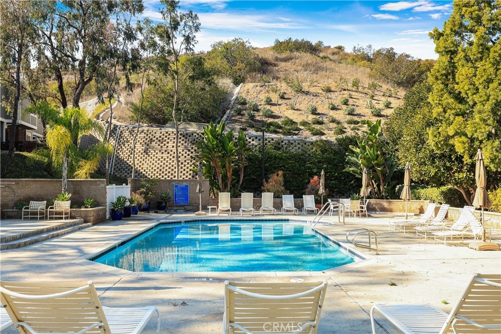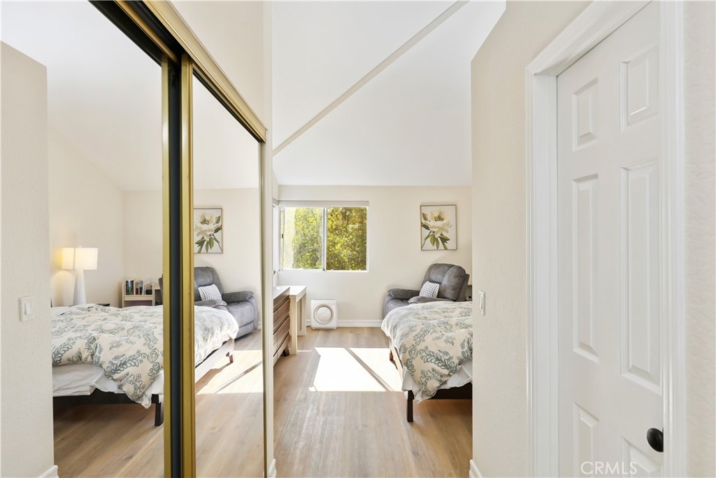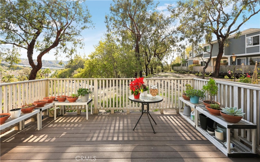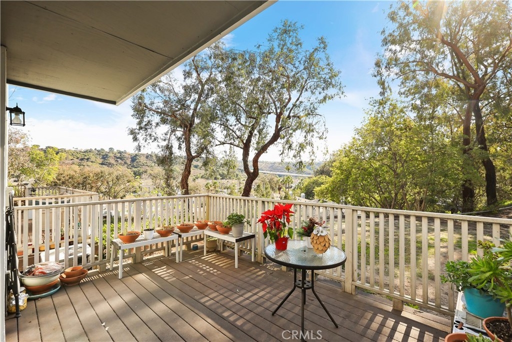 Nestled in the serene community of The Terraces, this beautifully updated townhouse-style condo boasts a PREMIUM lot with stunning views of the adjacent grassy greenbelt and surrounding trees. Located in the award-winning Laguna Beach school district and close to desirable community amenities, this home combines convenience with tranquility. Turn key and thoughtfully updated, the property offers a welcoming, homey atmosphere with no neighbors above or below. The living area greets you with vaulted ceilings and an inviting deck that overlooks the lush open space. A separate dining area adjoins the kitchen, which is equipped with upgraded appliances, granite countertops, recessed lighting, and a convenient pantry. The living room features a cozy stone-faced fireplace, laminate flooring throughout entire home, and easy access to the spacious deck – perfect for relaxing or entertaining. Upstairs, you’ll find the primary suite and a secondary bedroom, both with updated en-suite bathrooms and vaulted ceilings. The primary suite offers a walk-in closet, quartz countertop dual vanities, a linen cabinet, and remodeled enlarged walk in shower. Additional highlights include a one-car attached garage with direct access to the property, and a second detached garage located just steps away with shelving for additional storage!