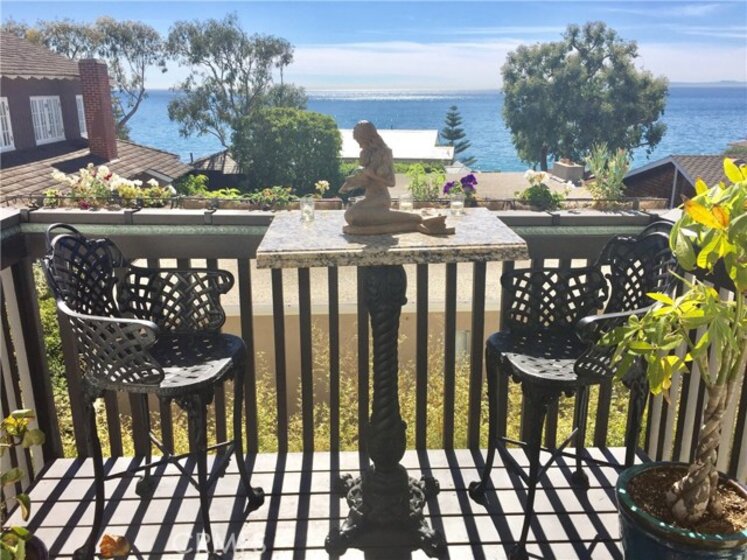 Turn-key Luxury condo in Laguna Village with panoramic Ocean Views of Catalina Island. Ocean side of Coast Hwy, just steps to the sand at Moss Point in scenic Woods Cove. Totally updated with hardwood floors throughout, Kohler sinks, updated faucets, double pane windows, French doors that open to a Coastline and Ocean View balcony. Remodeled Kitchen with Portico granite counters, custom cabinets and hardware, Stainless kitchen appliances, including microwave, dry bar with wine storage, crown molding. Charming electric fireplace in bedroom, Media center for 60" widescreen, custom ebony wood Murphy bed with lights that closes and turns Master suite into a den/office with bookcase and desk. Bathroom with pedestal sink, new oversize shower, custom closet, one car space in gated carport with storage, Community club house, walk to the beach just 50 yards away at Wood's Cove/Moss Street Beaches. Shops, restaurants and galleries are a block away and Free Trolley at corner that takes you to all festivals downtown. Great investment property also - rents between $3,500-4,000/mo. (never vacant!)