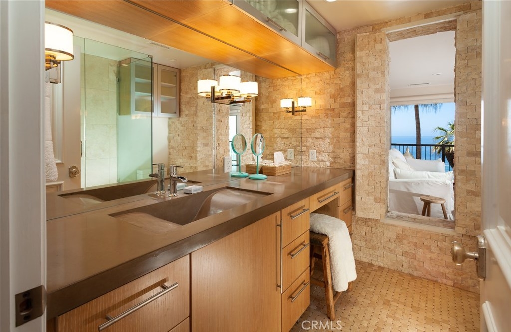 Beachfront Condo with Coveted Location! Renovated with a focus on aesthetics and quality, this home offers a luxurious interior and a sought-after location in a guard gated community with numerous amenities. Located on the front on the main floor, the home provides easy access to the beach, community pool/spa, exercise room and private, subterranean parking garage. Completely remodeled in 2011, the home features white oak floors and cabinets, heated tile floors in the bathrooms, and integrated surround sound. A wall of sliding glass doors opens to the reconstructed view deck, providing the ultimate in indoor/outdoor living. The kitchen showcases the quality and style found throughout the home. It features a rare granite backsplash, Wolf appliances, and a SubZero fridge. In the main living areas, endless ocean views are complemented by natural sea stone walls with custom accent lighting, creating spa-like tranquility. The natural stone continues in the master bath, which has concrete counters, a walk-in shower, and a secret door that reveals the ocean view. Completely turnkey and meticulously re-imagined, the home offers a full size washer/dryer, custom closets, a tankless water heater, remote-controlled blinds, all new plumbing, and elegant custom light fixtures. With numerous upgrades and a serene, private setting in a resort-like community with mature palm trees, this oceanfront condo makes every day feel like a vacation. Don’t miss out!