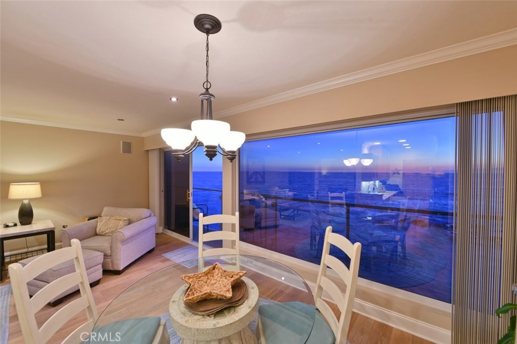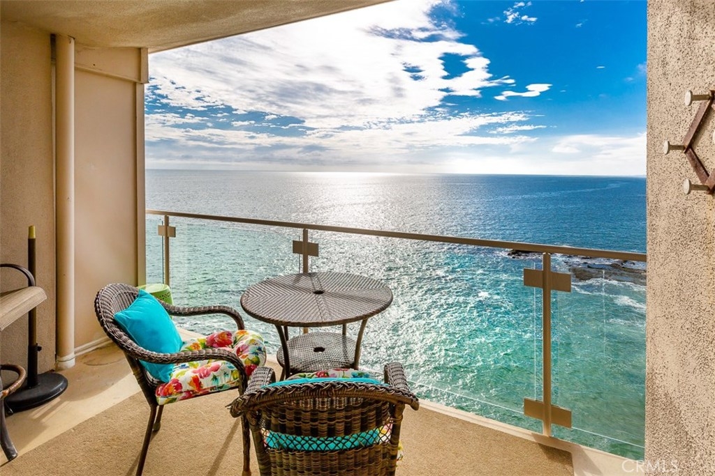 Unquestionably one of the most emotionally stunning locations in the famed Table Rock community perched on a rocky peninsula that juts out into the Pacific. This spectacular west facing unit offers mesmerizing views of Catalina Island, year round golden sunsets, north coast white water and city light views to Palos Verdes. The jaw-dropping views of crashing waves and white sandy beaches below are simply breathtaking from every room. This one-of-a-kind location and immaculate, remodeled home with newer hardwood floors in “beach chic” style is both modern and comfortable for weekend getaways or a long term residence. A balcony stretches the length of the unit for al-fresco dining and a Terrazzo stone fireplace glows in the living room on cooler winter nights. Each bedroom has an en-suite bath and the guest room features a Murphy bed that allows the room to double as an office. The spacious master suite has a private balcony to take in the awe-inspiring views with a glass of wine. An updated kitchen is adjacent to the dining room with walls of glass to the crashing surf below. This premium 3rd floor location has no steps from your private garage to the unit. The complex offers a beautiful pool in the center courtyard, lush tropical landscape, ample guest parking and easy access to one of the best beaches in Laguna. A/C has been approved by the HOA for those owners that desire. Seller may carry!! Creative terms available!